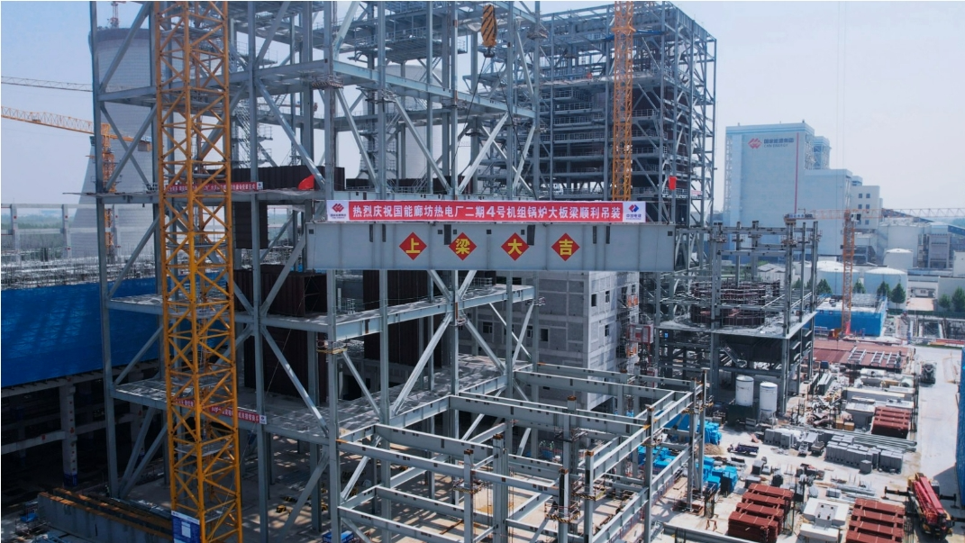 圖:國(guó)電電力廊坊熱電世界首例耦合煙氣熔鹽儲(chǔ)熱鍋爐大板梁吊裝施工現(xiàn)場(chǎng)