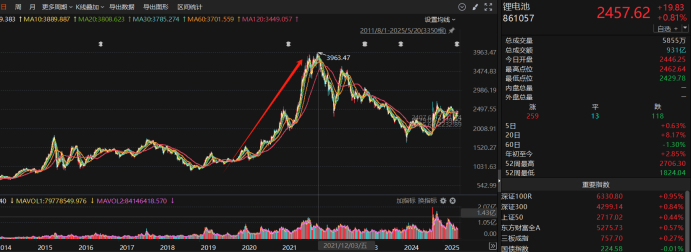 遙想2019年至2021年年底那波瘋狂的“鋰電池”行情,記憶猶新的就是碳酸鋰的價(jià)格一度走高至接近60萬(wàn)/噸的天價(jià),彼時(shí)僅國(guó)產(chǎn)新能源汽車(chē)爆發(fā)后的市場(chǎng)預(yù)期,就帶動(dòng)了整個(gè)鋰電池產(chǎn)業(yè)鏈各種原材料價(jià)格的走高,比如當(dāng)時(shí)有“新液體黃金”的六氟磷酸鋰在供給剛性的背景下,迎來(lái)價(jià)格上漲周期,半年時(shí)間從8萬(wàn)元/噸快速上漲至40萬(wàn)元以上,漲幅超過(guò)400%,最高曾突破60萬(wàn)/噸。原材料上市公司受到“戴維斯雙擊”的利好影響,疊加機(jī)構(gòu)抱團(tuán),當(dāng)年造就了一大批千億級(jí)別的上市公司。