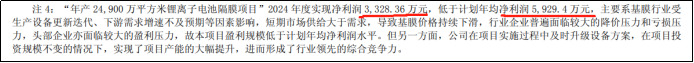 公司的隔膜基膜因設(shè)備也同樣遭到?jīng)_擊,隨著國(guó)產(chǎn)化加速,新進(jìn)入者涌入市場(chǎng),價(jià)格持續(xù)下挫。2024年公司的基膜項(xiàng)目“年產(chǎn)24900萬(wàn)平方米鋰離子電池隔膜項(xiàng)目”,全年僅實(shí)現(xiàn)效益3328.36萬(wàn)元,遠(yuǎn)低于預(yù)期的5929.4萬(wàn)元。