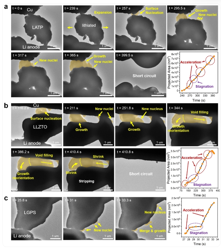 中國科學院金屬研究所沈陽材料科學國家研究中心王春陽研究員聯(lián)合國際團隊近期取得重要突破,利用原位透射電鏡技術首次在納米尺度揭示了無機固態(tài)電解質(zhì)中的軟短路-硬短路轉變機制及其背后的析鋰動力學,研究成果5月20日發(fā)表在《美國化學會會刊》。