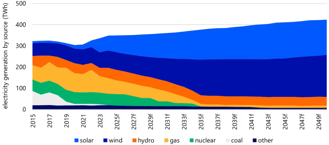 圖1:伊比利亞半島按能源類型劃分的發(fā)電結(jié)構(gòu)(2015-2050預(yù)測)