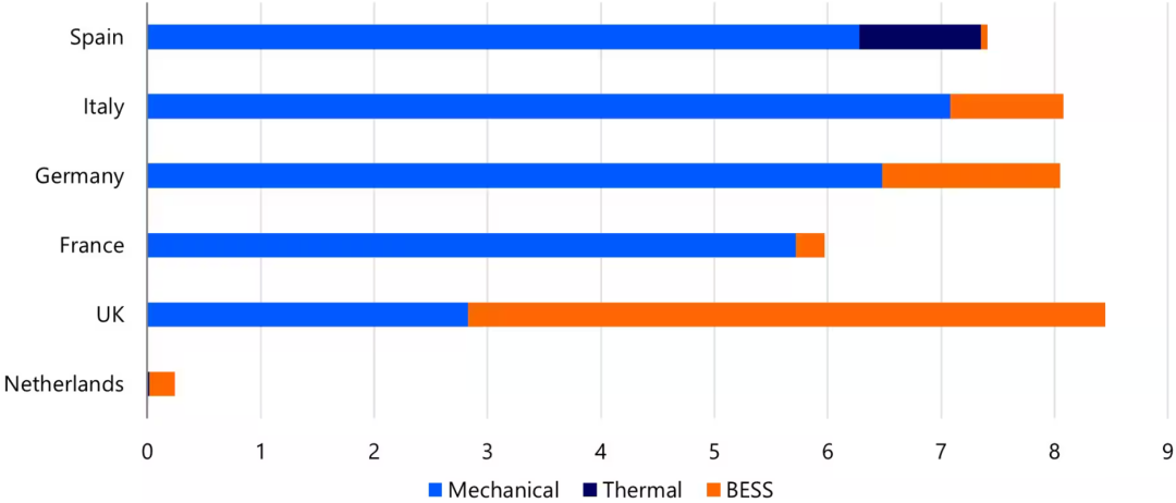 就整體儲能裝機(jī)容量而言,西班牙是歐洲領(lǐng)先國家之一(見圖2)。目前,西班牙已安裝6.3GW水電儲能和1GW熱力儲能,其非BESS儲能規(guī)模高于任何其他歐洲國家。因此,西班牙對BESS整合可再生能源的需求不如英國等國緊迫。