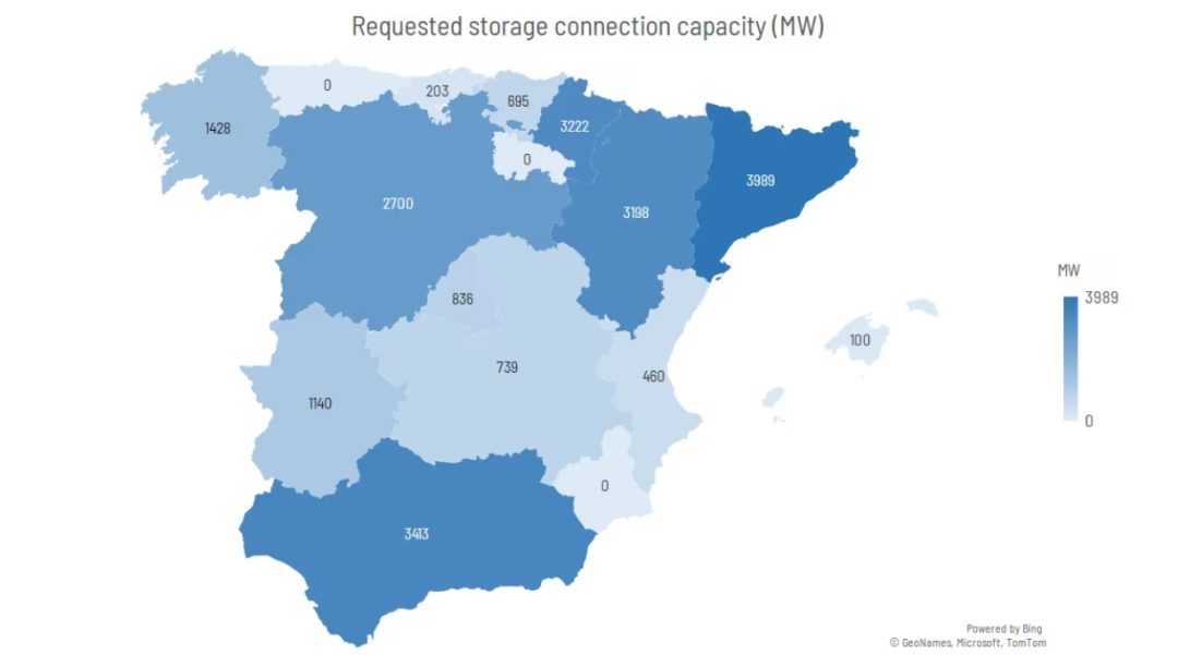得益于西班牙已安裝的大型水電和熱力儲能系統(tǒng)以及其電網(wǎng)的強(qiáng)韌,西班牙對電池儲能系統(tǒng)(BESS)的需求相對較低。截至目前,BESS缺乏明確的監(jiān)管框架也阻礙了其在西班牙的發(fā)展。盡管如此,已申請的并網(wǎng)容量總和已接近《國家儲能戰(zhàn)略》中設(shè)定的2030年目標(biāo)。