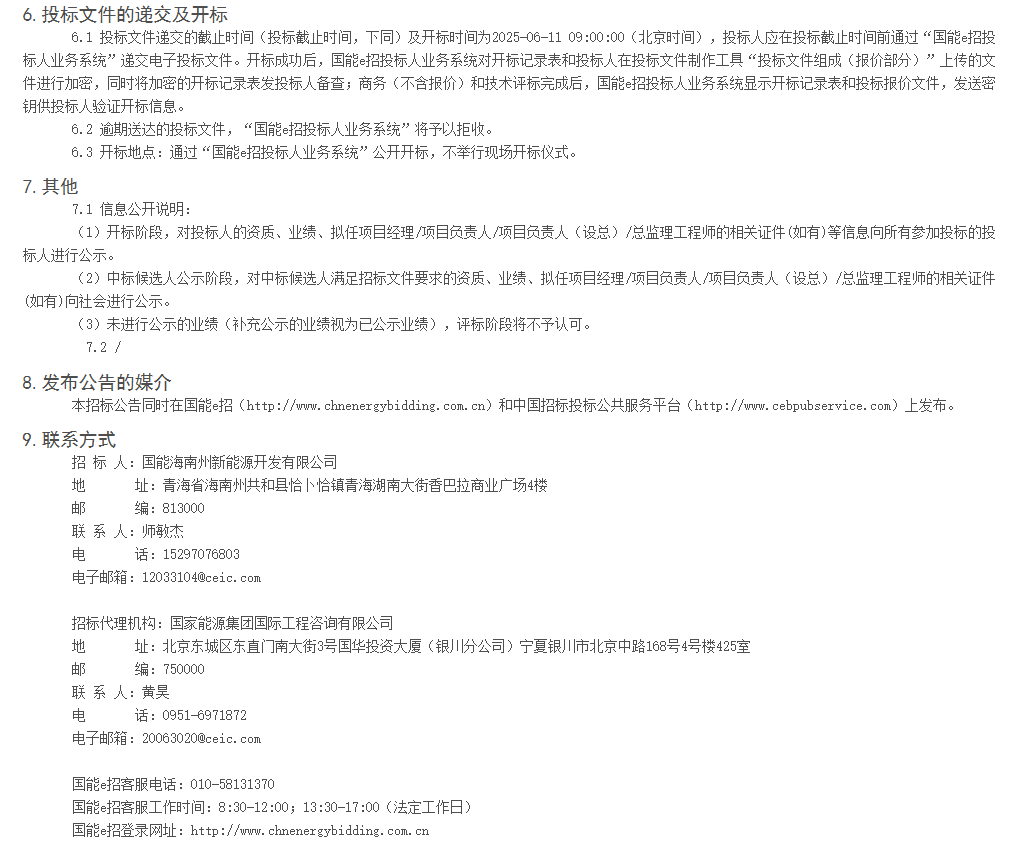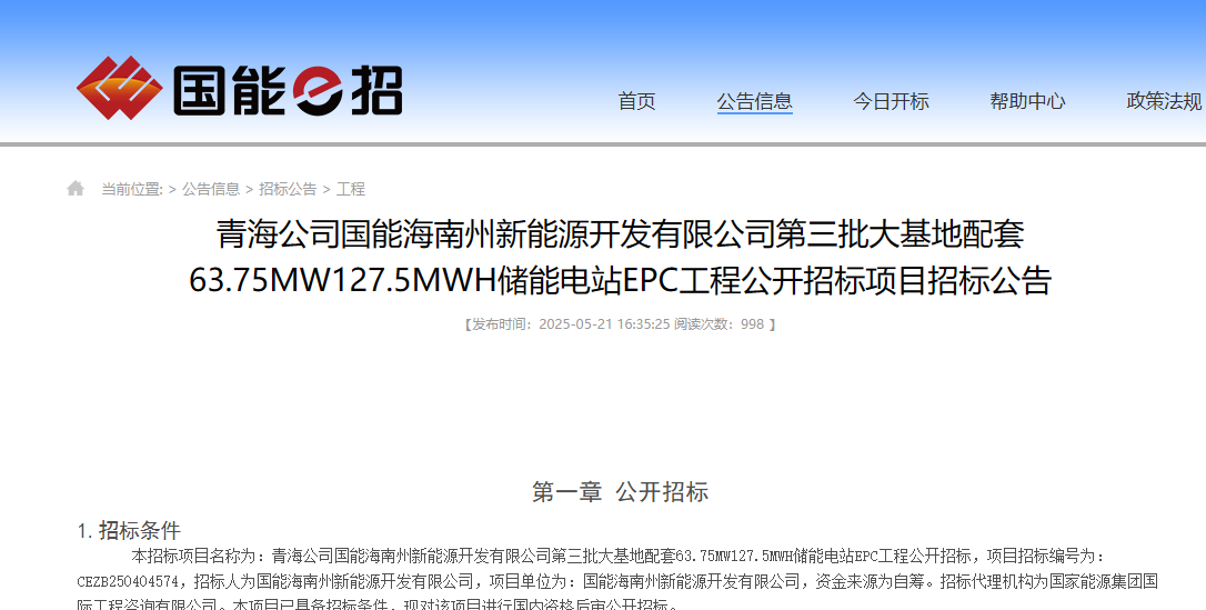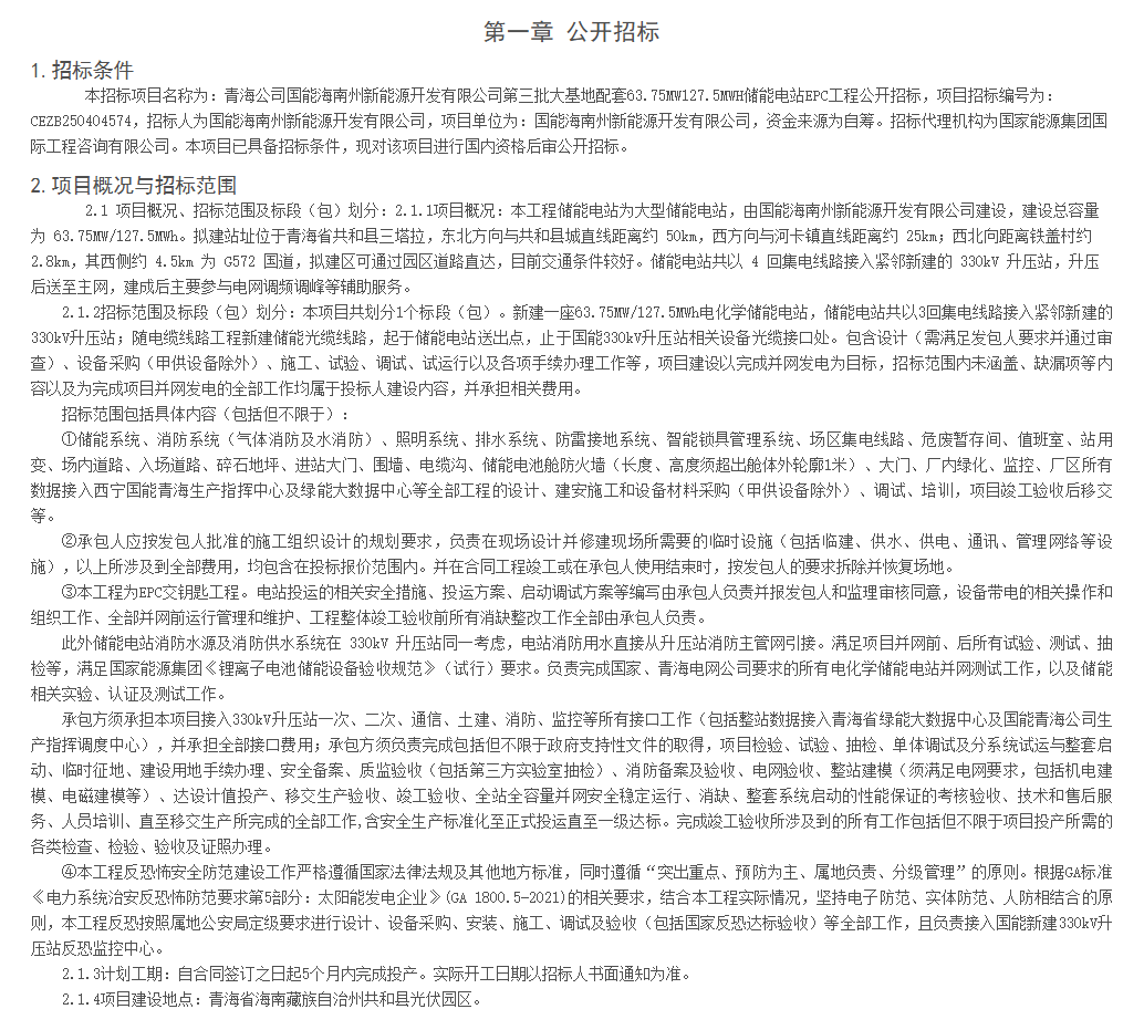 中國儲(chǔ)能網(wǎng)訊:5月21日,青海公司國能海南州新能源開發(fā)有限公司第三批大基地配套63.75MW127.5MWH儲(chǔ)能電站EPC工程公開招標(biāo)項(xiàng)目招標(biāo)公告發(fā)布。