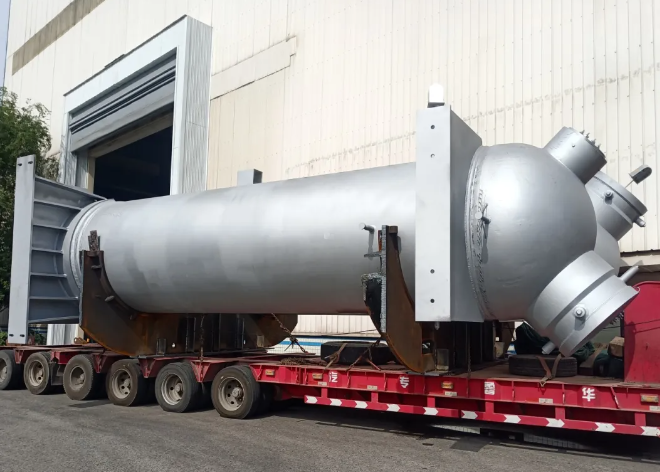 該項(xiàng)目換熱器管系采用特殊結(jié)構(gòu)設(shè)計(jì),有效提升熱能轉(zhuǎn)換效率。該設(shè)備屬于“發(fā)卡式”雙殼體結(jié)構(gòu),是公司目前為止制造的最大直徑發(fā)卡式結(jié)構(gòu)換熱器,其制造工藝與常規(guī)發(fā)卡式換熱器存在較大差別,難度更大,創(chuàng)下廠內(nèi)同類產(chǎn)品制造新紀(jì)錄。