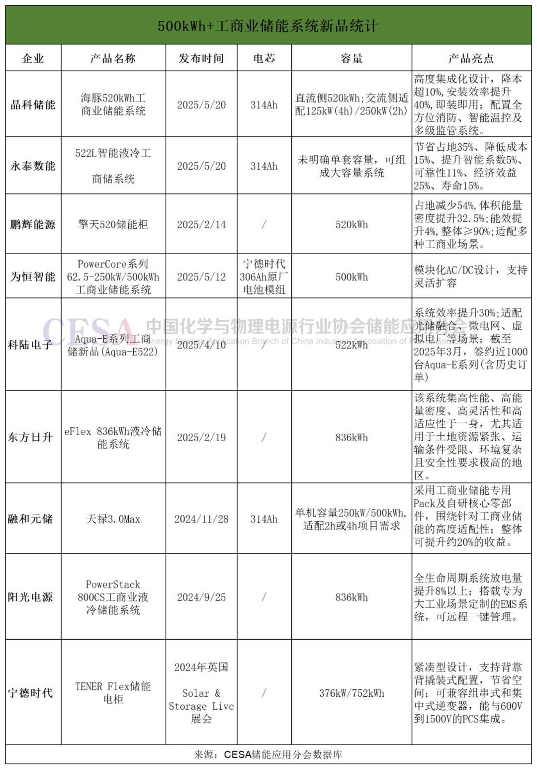 2025年以來(lái),這一賽道的產(chǎn)品集中涌現(xiàn),市場(chǎng)上已有近10家企業(yè)推出了500kWh+大容量工商儲(chǔ)產(chǎn)品。