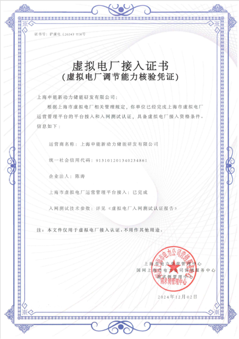 2024年,為規(guī)范虛擬電廠注冊及運(yùn)行流程,上海電力交易中心發(fā)布《上海市虛擬電廠注冊指引(試行)》文件,虛擬電廠運(yùn)營商需通過電網(wǎng)負(fù)荷管理中心或電網(wǎng)調(diào)控中心安排專業(yè)資質(zhì)檢測并獲取相應(yīng)報告。申能儲能迅速響應(yīng)號召,8月14日配合電網(wǎng)開展測試,采用云邊結(jié)合形式,當(dāng)日便通過專業(yè)機(jī)構(gòu)檢測,并于12月2日獲取《虛擬電廠調(diào)節(jié)能力核驗(yàn)憑證》(見圖2)及《虛擬電廠入網(wǎng)測試認(rèn)證報告》,成為上海市首批獲得調(diào)節(jié)能力校驗(yàn)憑證的負(fù)荷聚合商。