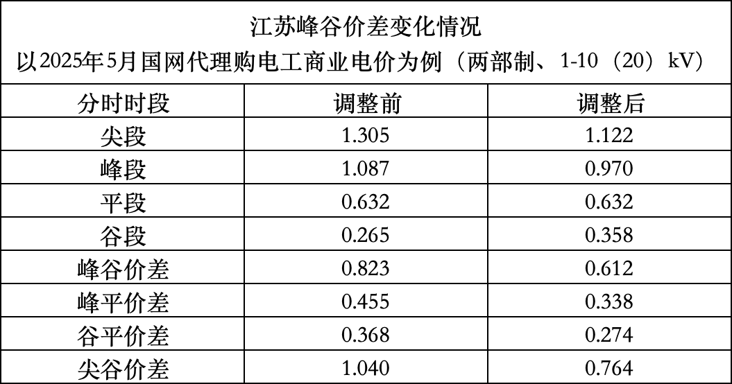 以2025年5月江蘇省1-10(20)kV代理購電工商業(yè)用戶電價為例,新政實施后,峰谷價差從調(diào)整前的0.8225元/kWh降至0.6122元/kWh,降幅高達(dá)25.57%。