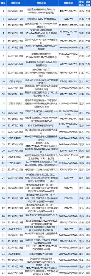 表 2025年百兆瓦級工商業(yè)儲能項(xiàng)目