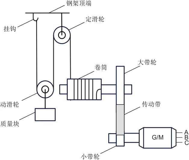 系統(tǒng)主要由質量塊、發(fā)電/電動機、傳動裝置、曳引裝置和鋼架五大部分組成,其中傳動裝置由大帶輪、傳動帶和小帶輪組成,曳引裝置則由卷筒和鋼絲繩組成。質量塊是重力勢能的儲存單元,發(fā)電/電動機是系統(tǒng)進行機電能量轉換的核心,而傳動裝置用于在高轉速、小轉矩的電機側與低轉速、大轉矩的機械側之間建立聯系,曳引裝置用于執(zhí)行質量塊的升降,鋼架的高度則決定了質量塊升降的最大高度差。