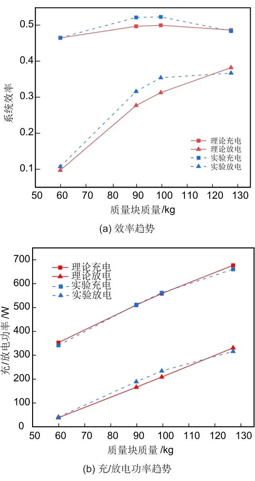 根據實驗數據對計算不同質量塊質量下的系統(tǒng)充/放電效率及功率,與理論結果比較,如圖4所示。