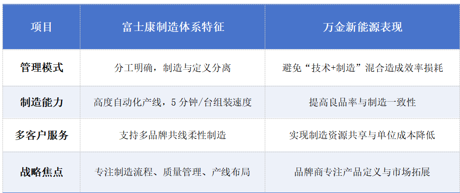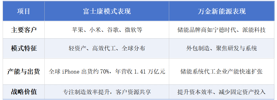 對照富士康,萬金新能源的軌跡有異曲同工之妙:兩者都源于深厚的制造基因(鈑金vs 電子組裝),都通過規(guī)模化和垂直整合(萬金在物理制造領(lǐng)域的一體化)來追求極致的效率和成本,都將服務(wù)頭部客戶作為核心戰(zhàn)略,并憑借高標(biāo)準(zhǔn)贏得信任。萬金已與寧德時(shí)代、陽光電源等巨頭深度合作,并能在這些客戶特定產(chǎn)品線中占據(jù)高份額,這證明了其制造能力已達(dá)到市場最頂尖的要求,并具備了承接大規(guī)模外包訂單的資質(zhì)和信任基礎(chǔ)。