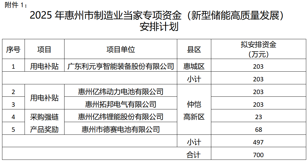 惠州市工業(yè)和信息化局關(guān)于下達(dá)2025年惠州市制造業(yè)當(dāng)家專項資金(新型儲能高質(zhì)量發(fā)展)安排計劃的通知