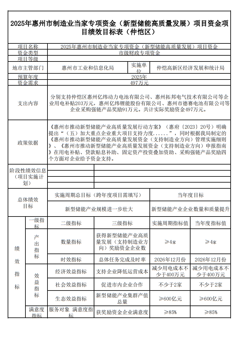 2.2025年惠州市制造業(yè)當(dāng)家專項資金(新型儲能高質(zhì)量發(fā)展)績效目標(biāo)表(惠城區(qū)、仲愷區(qū))