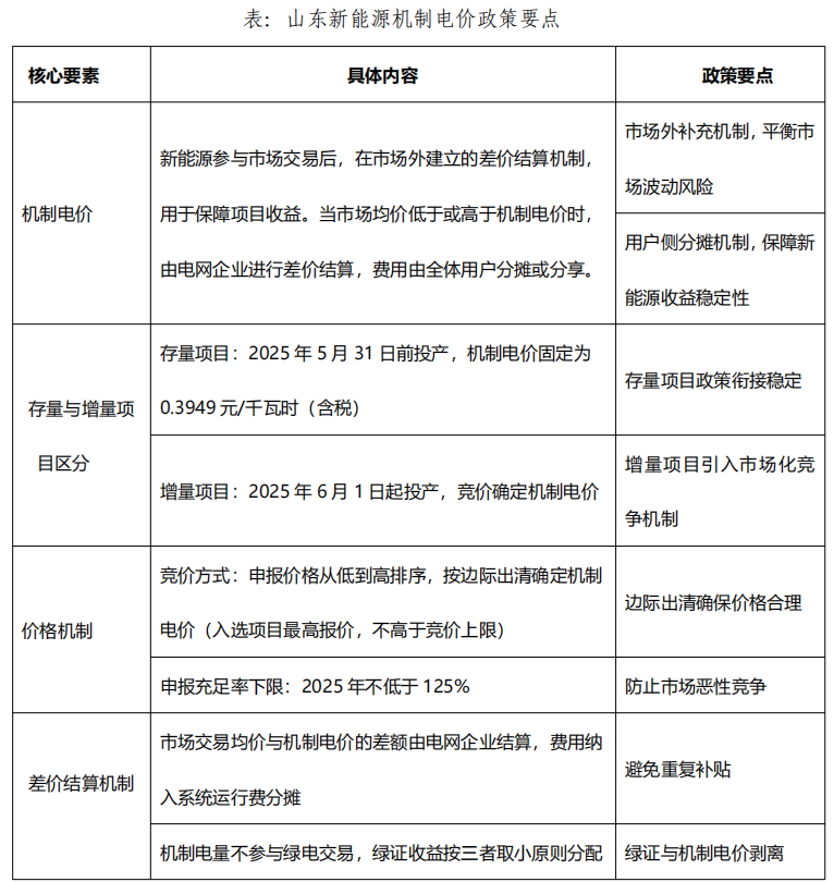 山東在全國首次明確機制電價 0.3949 元/千瓦時,為存量新能源電站提供了穩(wěn)定的收益預期,但非全額保障并網(wǎng),保留部分市場化上網(wǎng)電量?!兑庖姟窂娬{(diào),“單個項目機制電量上限參考外省新能源非市場化率,適度優(yōu)化”。