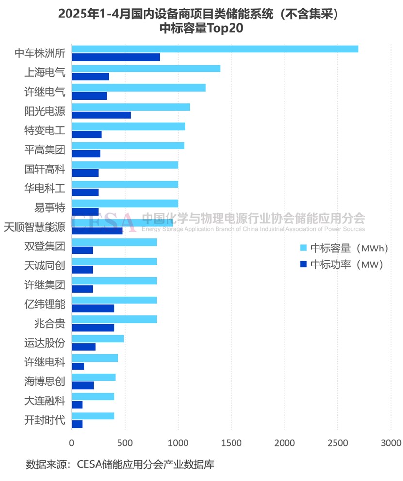 2025年1-4月,在項目類儲能系統(不含集采,含壓縮空氣儲能設備)中標企業(yè)中,中車株洲所以絕對優(yōu)勢遙遙領先,中標規(guī)模高達827.9MW/2694.7MWh,其攬獲的大項目包括新疆華電喀什300MW/1200MWh磷酸鐵鋰電化學儲能系統、吳起250MW/750MWh構網型獨立儲能項目儲能系統設備采購、山東發(fā)展投資景泰東190MW/760MWh儲能電站項目95MW/380MWh電化學儲能系統設備,以及新津區(qū)鄧雙100MW/200MWh獨立儲能電站項目儲能系統設備采購等。