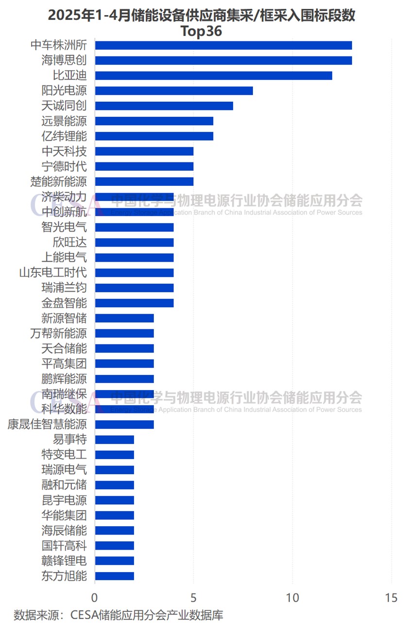 2025年1-4月,中電建、中核集團、中廣核、華電集團、國電投、華能集團、中石油、尚威環(huán)境、三峽集團、新風光等多個企業(yè)儲能系統/電芯集采/框采招標工作落地。由于多數儲能集采/框采項目未公布各中標企業(yè)的具體分配占比,我們以入圍標段數量作為主要分析對象。據CESA儲能應用分會產業(yè)數據庫不完全統計,1-4月共有18家企業(yè)入圍標段數不低于4個,其中,中車株洲所、海博思創(chuàng)和比亞迪儲能集采/框采入圍均超過10個標段數,表現尤為突出。