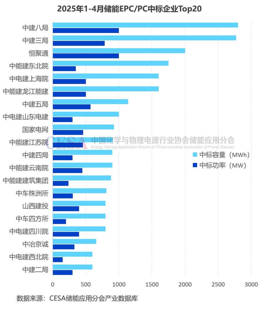 就儲能EPC/PC中標企業(yè)分析,2025年1-4月,中能建、中建、中電建三大集團中標規(guī)模高達8.87GW/23.96GWh,占全國儲能EPC/PC(含設備)采招落地總規(guī)模的58.75%。