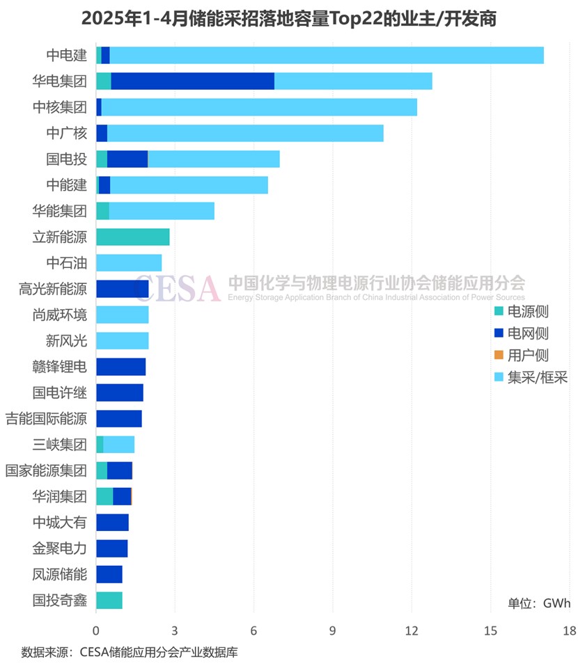 就業(yè)主/開發(fā)商需求分析,2025年1-4月,國內共421家企業(yè)完成儲能(含設備)相關采招工作。大規(guī)模采購需求主要來自于大型能源央企,其中,中電建、華電集團、中核集團、中廣核采招落地規(guī)模均在10GWh以上,需求最多。國電投、中能建采招落地超6GWh,華能集團采招落地規(guī)模在4GWh以上。此外,立新能源、中石油、新風光、尚威環(huán)境、高光新能源采招落地規(guī)模均超過2GWh,贛鋒鋰電、國電許繼、吉能國際能源、三峽集團、國家能源集團、華潤集團、中城大有、金聚電力、國投奇鑫、鳳源儲能采招落地規(guī)模也都在1GWh以上。