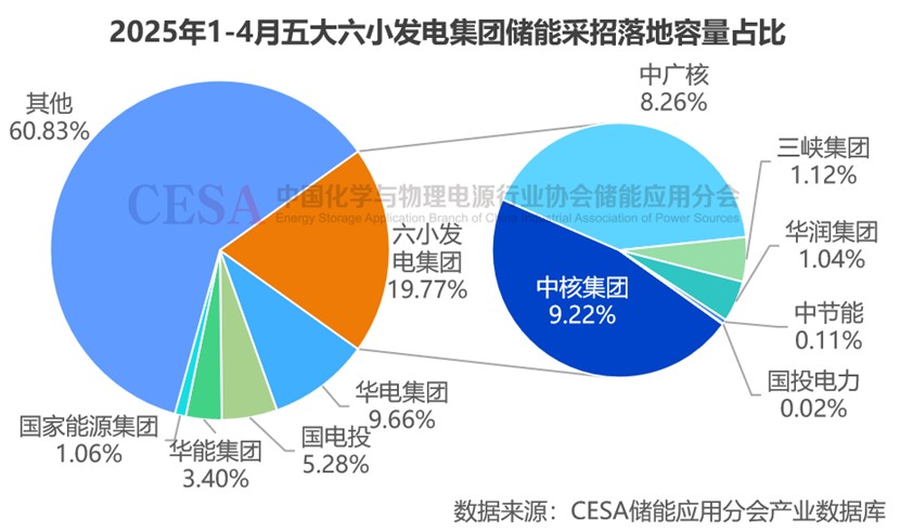 值得一提的是,電力央企是儲能需求的主要驅動力之一。2025年1-4月,五大六小發(fā)電集團儲能采招落地規(guī)模超50GWh,占比高達39.17%。其中,華電集團、國電投、華能集團、國家能源集團等五大發(fā)電集團采招落地規(guī)模共25.67GWh,占比19.40%;中核集團、中廣核、三峽集團、華潤電力等六小發(fā)電集團采招落地26.15GWh,占比19.77%。