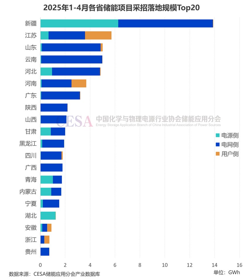 從區(qū)域分布來看,2025年1-4月,新疆儲能采招落地項目規(guī)模領跑全國,達到3.65GW/13.9GWh,容量規(guī)模占項目類(不含集采)總采招落地規(guī)模的21.74%。其中多個GWh級項目采招完成,包括昌吉國投奇臺縣180萬千瓦風光氫儲一體化項目250MW/1000MWh儲能系統設備采購、新疆華電烏魯木齊1GW/4GWh獨立新型儲能示范項目、新疆華電喀什1GW/4GWh獨立儲能項目、新疆立新能源和田縣300MW/1200MWh構網型儲能電站等。