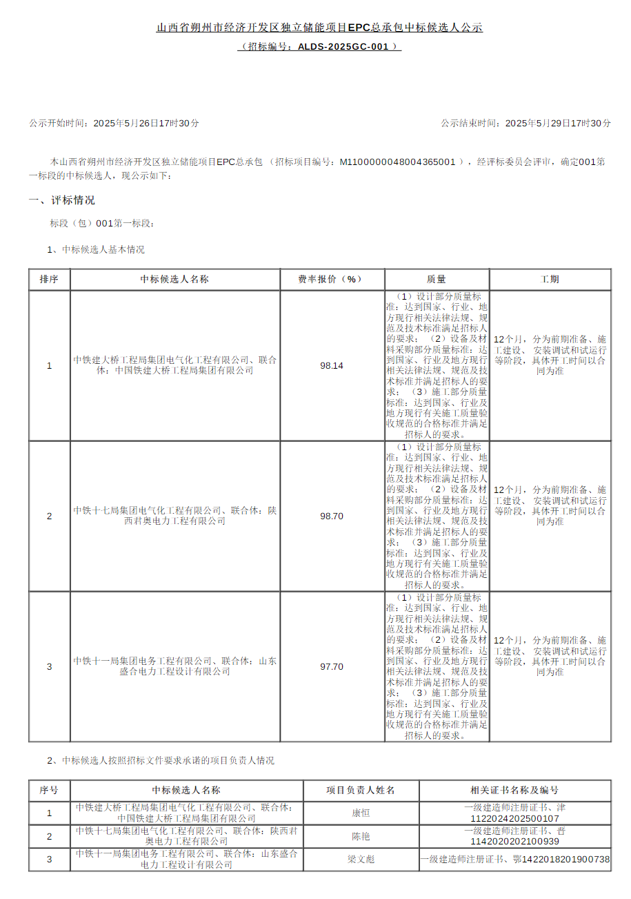 中國儲能網(wǎng)訊:5月26日,山西省朔州市經(jīng)濟(jì)開發(fā)區(qū)獨(dú)立儲能項(xiàng)目EPC總承包中標(biāo)候選人公示。