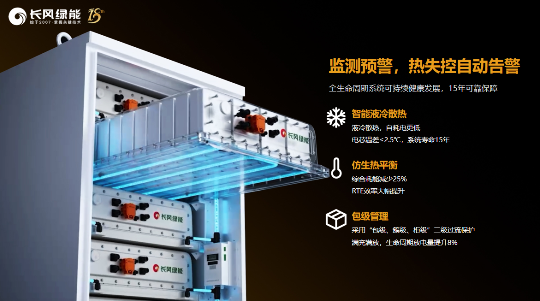 精準溫控技術:長風綠能獨家研發(fā)的智能化溫控管理系統(tǒng),將電芯溫差控制在±2.5℃以內,較傳統(tǒng)風冷方案溫差降低70%,有效延長電池使用壽命。