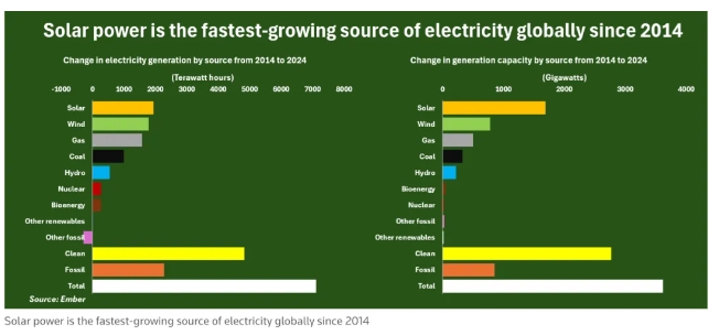 在過(guò)去十年中,公用事業(yè)公司在發(fā)電網(wǎng)絡(luò)中增加了兩倍多的太陽(yáng)能發(fā)電能力,超過(guò)了其他任何電力來(lái)源,這主要得益于太陽(yáng)能系統(tǒng)的相對(duì)低成本和快速連接時(shí)間。根據(jù)能源智庫(kù)Ember的數(shù)據(jù),截至2024年全球電力系統(tǒng)共有1866吉瓦(GW)的公用事業(yè)規(guī)模太陽(yáng)能發(fā)電能力。該裝機(jī)規(guī)模是2014年產(chǎn)能的10倍,在此期間,在所有主要電力來(lái)源中,太陽(yáng)能發(fā)電能力的增長(zhǎng)遠(yuǎn)遠(yuǎn)超過(guò)了其他任何主要電力來(lái)源。 在過(guò)去的十年中,風(fēng)能發(fā)電的產(chǎn)能增長(zhǎng)位居第二,增長(zhǎng)了3.2倍,而所有其他發(fā)電來(lái)源的裝機(jī)容量增長(zhǎng)均未超過(guò)兩倍。