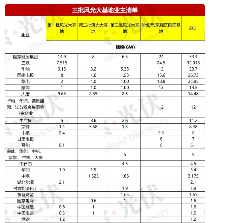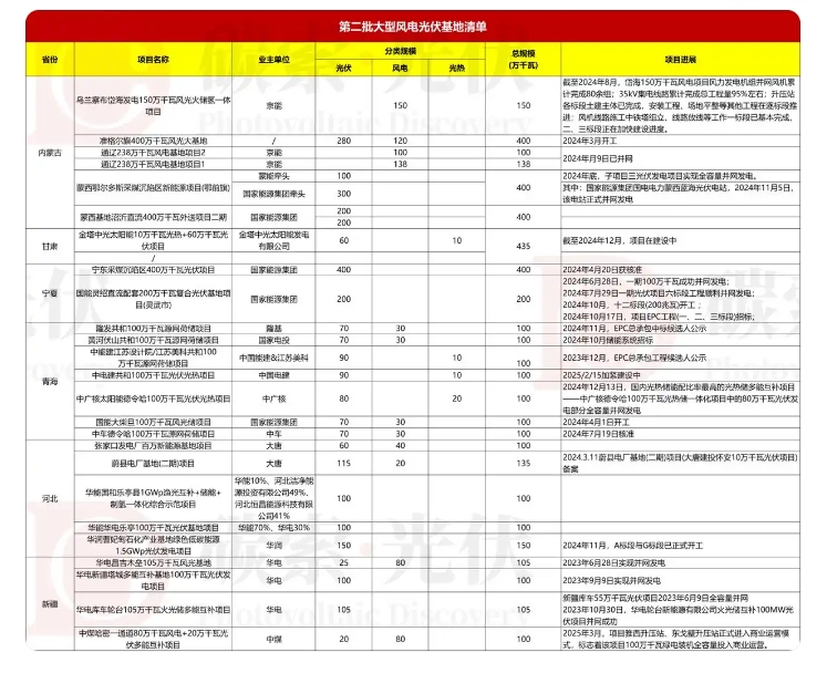 目前,第二、三批風(fēng)光大基地的具體批復(fù)規(guī)模尚未完全公開,但通過申報企業(yè)及地方主管部門信息,可梳理出部分已知業(yè)主的項(xiàng)目進(jìn)展: