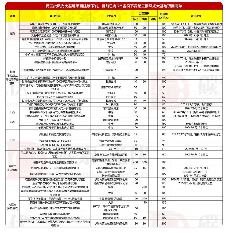 從信息公開情況看,國家級風(fēng)光大基地僅首批名單曾明確披露,后續(xù)第二、三批項(xiàng)目主要通過各省上報、優(yōu)選批復(fù)后由各省選擇性披露。
