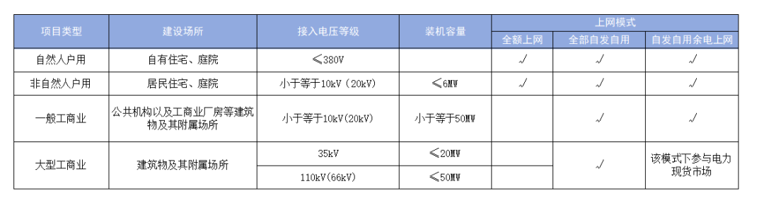 《管理辦法》將分布式光伏發(fā)電項目按照建設(shè)場所、接入電壓等級和裝機(jī)容量,細(xì)分為自然人戶用、非自然人戶用、一般工商業(yè)、大型工商業(yè)四種類型,全額上網(wǎng)、全部自發(fā)自用和自發(fā)自用余電上網(wǎng)三種上網(wǎng)模式。其中,自然人戶用、非自然人戶用分布式光伏項目三種上網(wǎng)模式可任選,一般工商業(yè)分布式光伏項目在全部自發(fā)自用、自發(fā)自用余電上網(wǎng)中二選一,大型工商業(yè)分布式光伏項目原則上選擇全部自發(fā)自用模式(在電力現(xiàn)貨市場連續(xù)運行地區(qū),大型工商業(yè)分布式光伏可通過自發(fā)自用余電上網(wǎng)模式參與現(xiàn)貨市場)。