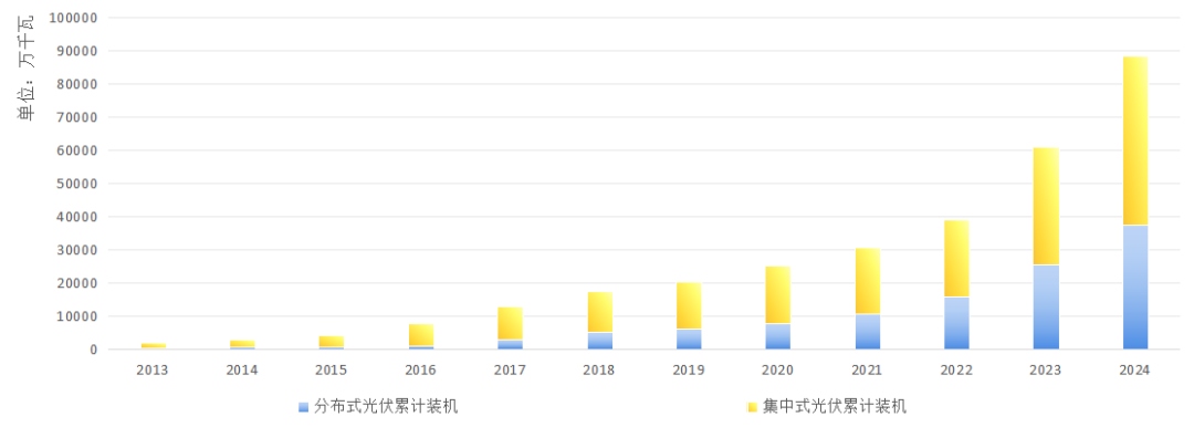 據(jù)國家能源局公布數(shù)據(jù),在我國光伏行業(yè)發(fā)展之初的2013年,我國分布式光伏裝機(jī)容量約310萬千瓦,在全部光伏發(fā)電裝機(jī)中占比16%;2024年底,分布式光伏累計裝機(jī)達(dá)到了2013年的121倍,約3.7億千瓦,占全部光伏發(fā)電裝機(jī)的比重達(dá)到了42%,幾乎占據(jù)了整個光伏發(fā)電的半壁江山。