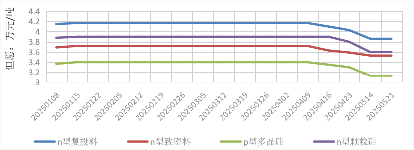進(jìn)入5月,多晶硅現(xiàn)貨市場成交量較少?!?30”過后市場需求大幅降低,市場成交價格隨之小幅下滑。截至5月21日,n型復(fù)投料成交價格區(qū)間為3.6萬~4.1萬元/噸,成交均價為3.86萬元/噸;n型顆粒硅成交價格區(qū)間為3.5萬~3.7萬元/噸,成交均價為3.6萬元/噸;p型多晶硅成交價格區(qū)間為3萬~3.5萬元/噸,成交均價為3.13萬元/噸。