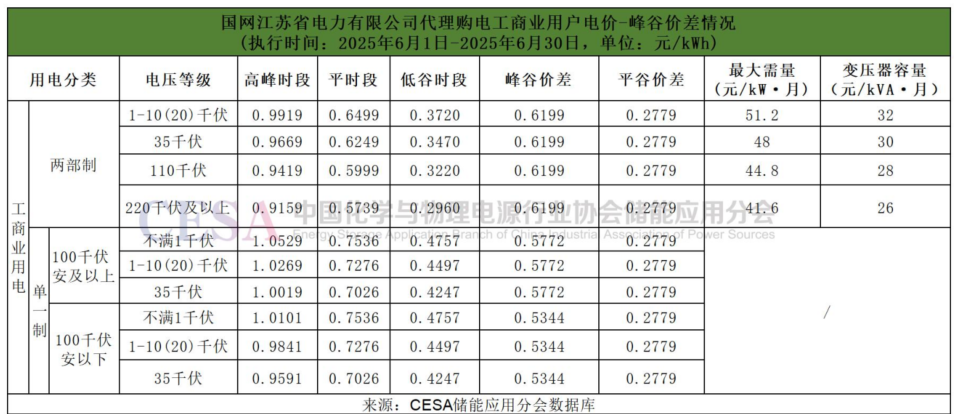 《國(guó)網(wǎng)江蘇省電力有限公司代理購(gòu)電工商業(yè)用戶(hù)電價(jià)表》顯示,6月,國(guó)網(wǎng)江蘇省的各電壓等級(jí)的峰谷價(jià)差全線(xiàn)縮小至0.5344-0.6199元/kWh的水平,其中兩部制工商業(yè)用戶(hù)的峰谷價(jià)差為0.6199元/kWh,較5月份0.8225元/kWh的峰谷價(jià)差下降24.63%。