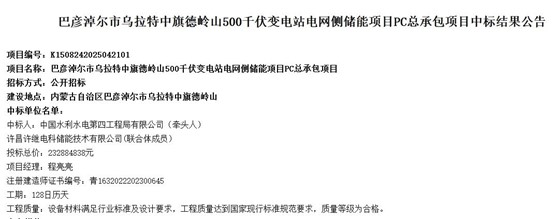 中國儲能網(wǎng)訊:2024年5月27日,內(nèi)蒙古巴彥淖爾市烏拉特中旗德嶺山儲能項目PC總承包中標結(jié)果正式揭曉,中國水利水電第四工程局與許昌許繼電科儲能技術有限公司組成的聯(lián)合體憑借23288.4838萬元、折合單價0.582元/Wh的報價成功中標。
