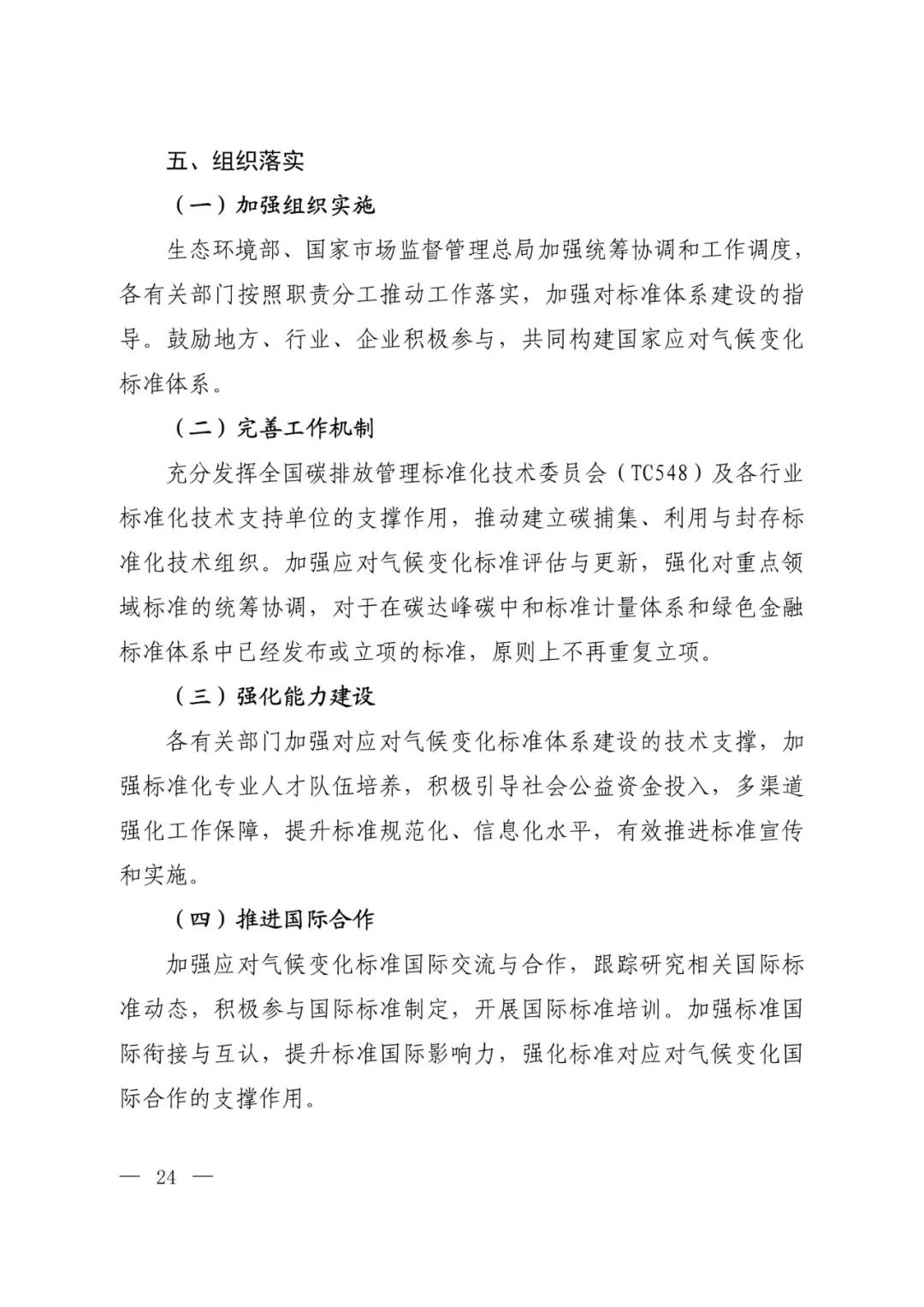 為深入貫徹黨的二十大和二十屆二中、三中全會(huì)精神,落實(shí)積極應(yīng)對(duì)氣候變化國(guó)家戰(zhàn)略,深入實(shí)施《國(guó)家標(biāo)準(zhǔn)化發(fā)展綱要》,加快構(gòu)建科學(xué)實(shí)用、系統(tǒng)規(guī)范的國(guó)家應(yīng)對(duì)氣候變化標(biāo)準(zhǔn)體系,生態(tài)環(huán)境部會(huì)同國(guó)家發(fā)展改革委、工業(yè)和信息化部、自然資源部、住房城鄉(xiāng)建設(shè)部、交通運(yùn)輸部、水利部、商務(wù)部、中國(guó)人民銀行、國(guó)家市場(chǎng)監(jiān)督管理總局、中國(guó)氣象局、國(guó)家能源局、國(guó)家林草局、國(guó)家鐵路局、中國(guó)民航局制定了《國(guó)家應(yīng)對(duì)氣候變化標(biāo)準(zhǔn)體系建設(shè)方案》?,F(xiàn)印發(fā)給你們,請(qǐng)結(jié)合實(shí)際抓好落實(shí)。