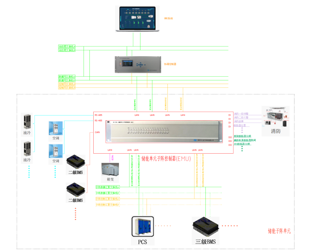 儲能單元子陣控制器(EMU)是儲能系統(tǒng)中負責對儲能單元子陣進行監(jiān)測、控制和管理的關鍵設備,是提升儲能系統(tǒng)效率、安全性與經濟性的核心樞紐。在保障儲能系統(tǒng)安全、穩(wěn)定、高效運行方面發(fā)揮著重要作用。儲能單元子陣控制(EMU)設計兼顧實時性、可靠性與靈活性,適應復雜多變的能源管理需求。
