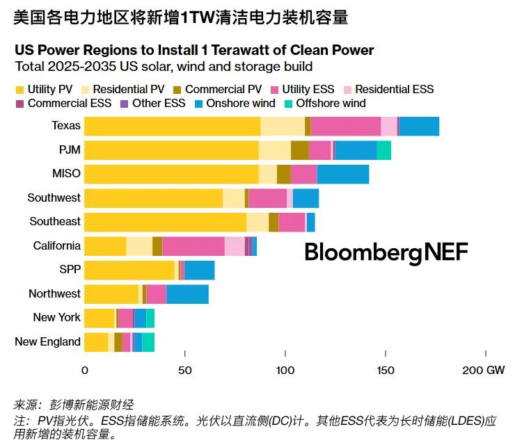 彭博新能源財經(jīng)預計,希望獲得更多燃氣發(fā)電的電網(wǎng)(如PJM、MISO、SPP和德克薩斯州)還將在2025-2035年間新增總計538GW的光伏、風電和儲能裝機。在所有這些市場中,光伏都在快速增長,因為它最適合滿足關(guān)鍵的夏季需求。