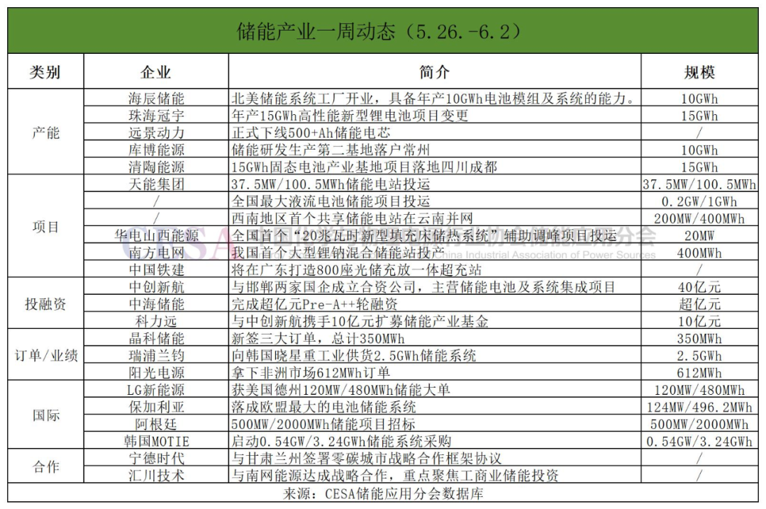 投融資方面,中創(chuàng)新航與邯鄲兩家國企成立合資公司,主營儲(chǔ)能電池及系統(tǒng)集成項(xiàng)目;鐵鉻液流企業(yè)中海儲(chǔ)能獲得超億元融資;科力遠(yuǎn)與中創(chuàng)新航攜手10億元擴(kuò)募儲(chǔ)能產(chǎn)業(yè)基金。