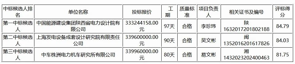 第一中標(biāo)候選人:中國(guó)能源建設(shè)集團(tuán)陜西省電力設(shè)計(jì)院有限公司,投標(biāo)報(bào)價(jià)33324.4158萬(wàn)元,折合單價(jià)0.555元/Wh;