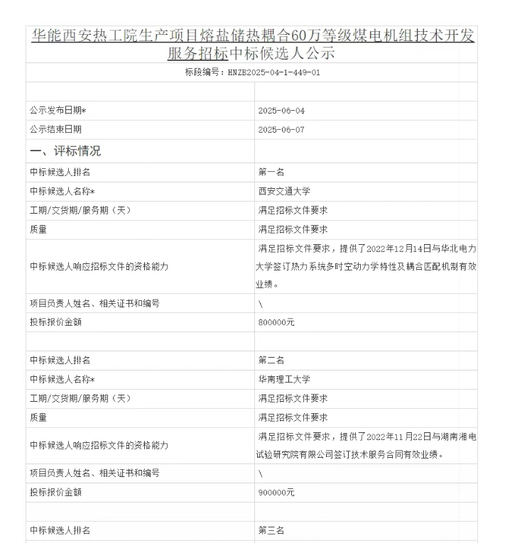 中國(guó)儲(chǔ)能網(wǎng)訊:6月4日,華能西安熱工院生產(chǎn)項(xiàng)目熔鹽儲(chǔ)熱耦合60萬(wàn)等級(jí)煤電機(jī)組技術(shù)開(kāi)發(fā)服務(wù)招標(biāo)項(xiàng)目發(fā)布中標(biāo)候選人公示,候選人第一名為西安交通大學(xué),投標(biāo)報(bào)價(jià)金額為800000元。