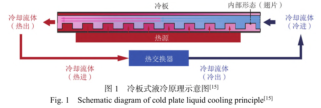 冷板式液冷主要組成部件是冷板、液體管道和液體介質(zhì),其原理如圖1所示,芯片工作時(shí)產(chǎn)生的熱量通過(guò)液冷板間接傳遞到液體介質(zhì)中并被帶走。1981年,TUCKERMAN等首次使用微通道冷板對(duì)芯片進(jìn)行冷卻。如今,冷板式液冷在液冷數(shù)據(jù)中心中應(yīng)用最廣泛。為了提高冷板式液冷的傳熱效率,降低能耗,可以通過(guò)對(duì)微通道冷板結(jié)構(gòu)優(yōu)化、液體介質(zhì)相變特性利用以及新型液體介質(zhì)開發(fā)三個(gè)方向進(jìn)行研究。