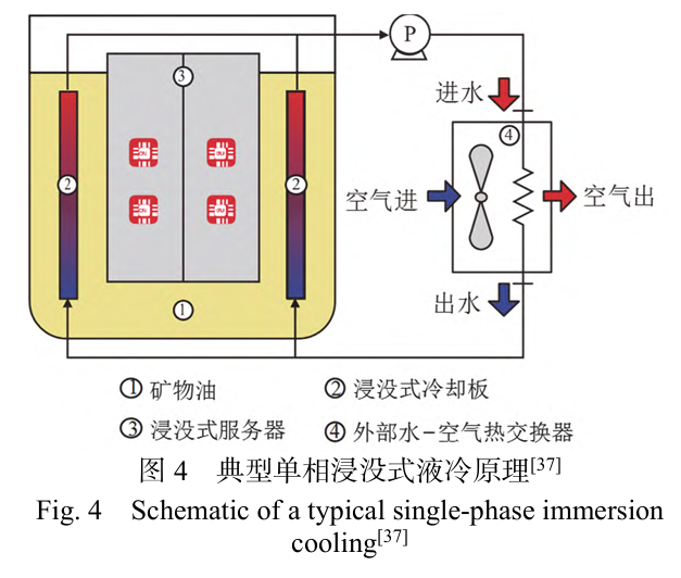 單相浸沒(méi)式液冷是利用冷卻液的比熱容吸收熱量,主要優(yōu)點(diǎn)是換熱效率高、結(jié)構(gòu)簡(jiǎn)單,不會(huì)產(chǎn)生冷卻液的逸散,對(duì)設(shè)備的密封性能要求低,典型的單相浸沒(méi)式液冷原理如圖4所示。