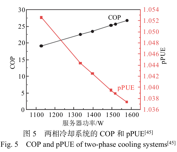 兩相浸沒(méi)式液冷相比單相浸沒(méi)式液冷的效率更高,主要是由于冷卻液的汽化潛熱較高,能夠吸收巨大的熱量,但對(duì)設(shè)備的密封性能也提出了更高的要求,要求保證冷卻箱的密封性不能有冷卻劑的逸散且要有一定的安全措施保證設(shè)備的正常運(yùn)行。SUN等對(duì)浸沒(méi)式液冷系統(tǒng)進(jìn)行了模擬,工作流體采用的是Novec 649和Novec 7000,對(duì)機(jī)柜結(jié)構(gòu)、工作流體和進(jìn)口速度等多個(gè)工作參數(shù)進(jìn)行研究,結(jié)果表明采用Novec 7000冷卻液的服務(wù)器系統(tǒng)芯片溫度更低,傳熱效率更高,隨著進(jìn)口液體流速的增加,芯片平均溫度下降,在使用Novec 649時(shí)在較低的速度范圍內(nèi)(0.2~0.6m/s),最大溫差下降了63.58%,溫度不均勻性系數(shù)下降了84.06%,而使用Novec 7000比Novec 649的平均溫度降低16.82℃,溫度不均勻系數(shù)下降14.5%。LIU等采用數(shù)值模擬對(duì)兩相浸沒(méi)式液冷系統(tǒng)的性能系數(shù)(coefficient of performance, COP)進(jìn)行評(píng)估和優(yōu)化,結(jié)果如圖5所示,當(dāng)服務(wù)器的運(yùn)行功率從1 127W增加至1577W時(shí),冷卻系統(tǒng)的COP也從19上升至26.7,且pPUE值下降至1.037,同時(shí)還發(fā)現(xiàn)增大服務(wù)器間距能使芯片溫度降低,原因是冷卻液汽化時(shí),氣泡會(huì)阻礙芯片散熱。