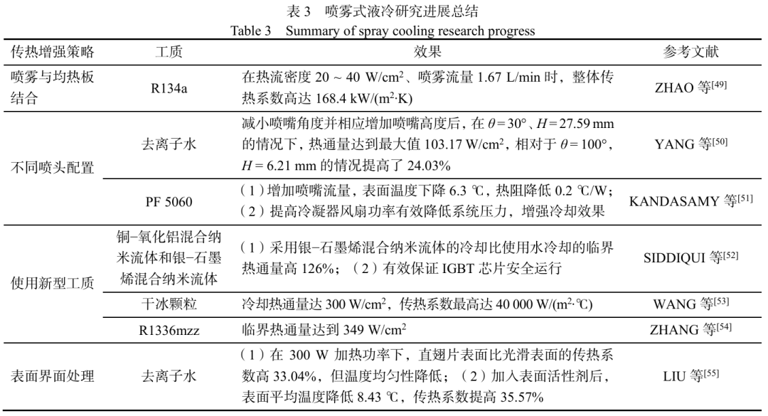 尋找更高傳熱效率、更優(yōu)性能的冷卻液也是噴霧式液冷的重點(diǎn)研究方向之一。SIDDIQUI 等使用銅?氧化鋁混合納米流體和銀?石墨烯混合納米流體作為噴霧流體,由于納米流體多孔殘留物表面的潤(rùn)濕性和吸濕性增強(qiáng),故臨界表面溫度比水更高,結(jié)果表明在噴霧壓力達(dá)0.143MPa時(shí),采用銀?石墨烯混合納米流體的冷卻比使用水冷卻的臨界熱通量高126%;此外,還發(fā)現(xiàn)混合納米噴霧可以使絕緣柵雙極晶體管(insulate-gate bipolar transistor, IGBT) 功率模塊保持在安全溫度以下運(yùn)行,但水和介電流體則不能。WANG等提出了采用干冰顆粒噴霧冷 卻電子元件的方法,利用焦耳?湯姆孫效應(yīng),當(dāng)高壓二氧化碳通過(guò)突然收縮的孔時(shí),流體壓力降低,溫度降低從而凝華成干冰被噴出,通過(guò)調(diào)節(jié)二氧化碳的入口溫度和壓力能有效控制產(chǎn)生的干冰比例,冷卻熱通量隨噴嘴入口速度增加而增加,當(dāng)噴嘴入口速度為30m/s時(shí),干冰比例為40%,熱源表面溫度為55℃,冷卻熱通量高達(dá)300W/c㎡,傳熱系數(shù)最高達(dá)40000W/(㎡·℃);干冰比例對(duì)冷卻熱通量和傳熱系數(shù)的影響較大,冷卻性能隨干冰比例線性增加 當(dāng)干冰比例為60%時(shí)最大冷卻熱通量達(dá)175W/c㎡。ZHANG 等研究了采用R1336mzz制冷劑的閃噴冷卻系統(tǒng),發(fā)現(xiàn)當(dāng)制冷劑工質(zhì)流量達(dá)1.4L/min時(shí),臨界熱通量達(dá)到349W/c㎡;提高傳熱性能還有兩種途徑,第一種是提高入口溫度從而降低熱阻,當(dāng)入口溫度為48.2℃時(shí),臨界熱通量比26.5℃時(shí)提高92.8%;第二種是通過(guò)減小霧化室的壓力,降低工質(zhì)的飽和溫度從而使熱能被液體汽化潛熱大量吸收。