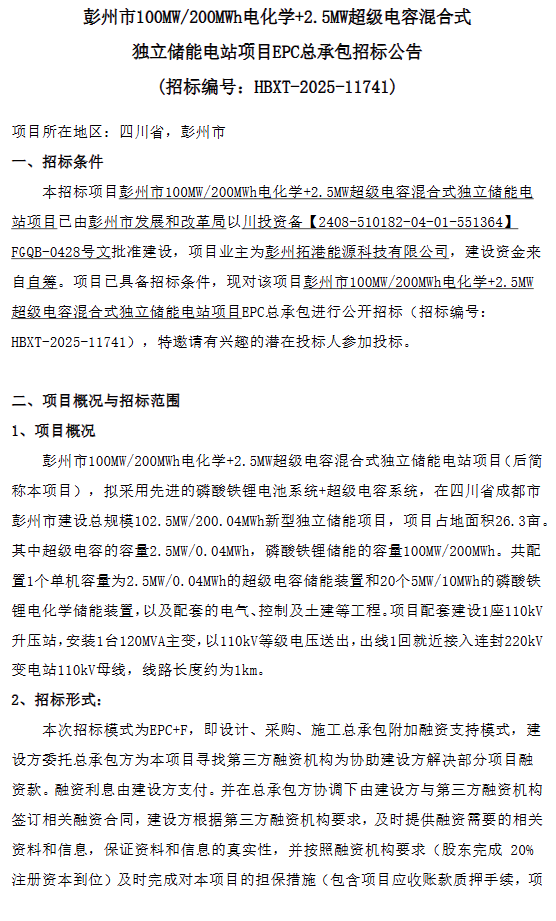 中國儲能網(wǎng)訊:6月5日,100MW/200MWh電化學(xué)+2.5MW超級電容混合式獨(dú)立儲能電站項(xiàng)目EPC招標(biāo)發(fā)布。項(xiàng)目業(yè)主為彭州拓港能源科技有限公司,建設(shè)資金來源為自籌。