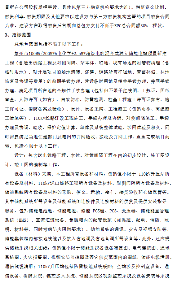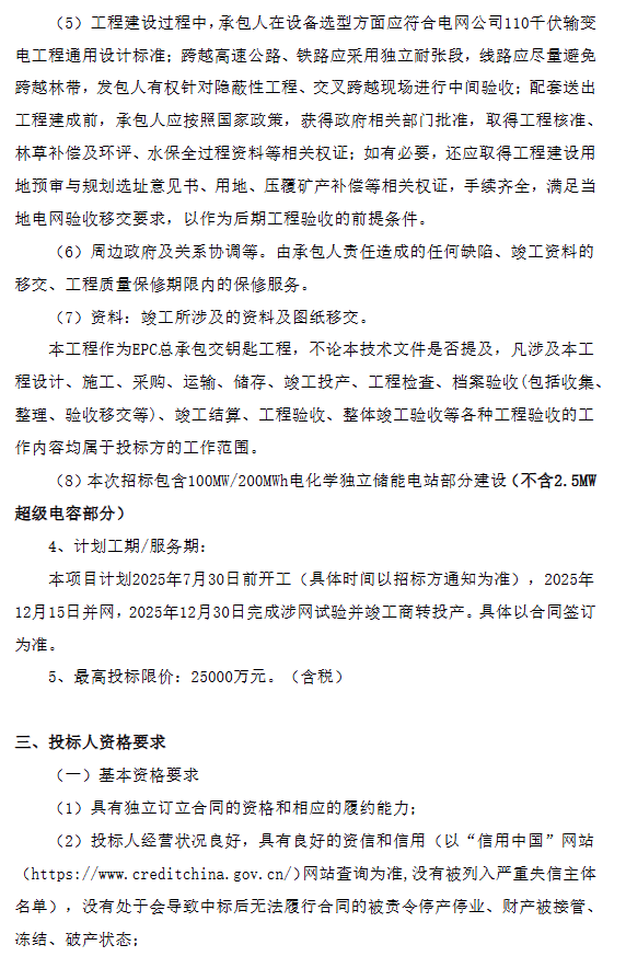 本次招標(biāo)包含100MW/200MWh電化學(xué)獨(dú)立儲能電站部分建設(shè)(不含2.5MW超級電容部分)。計劃2025年7月30日前開工,2025年12月15日并網(wǎng),2025年12月30日完成涉網(wǎng)試驗(yàn)并竣工商轉(zhuǎn)投產(chǎn)。具體以合同簽訂為準(zhǔn)。