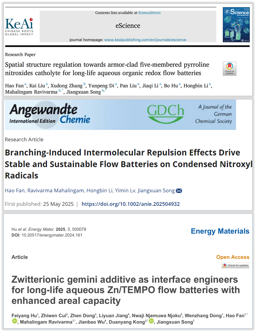 上述研究成果分別以《分子鎧甲化的長壽命五元吡咯啉氮氧自由基類液流電池正極電解質(zhì)》(Spatial structure regulation towards armor-clad five-membered pyrroline nitroxides catholyte for long-life aqueous organic redox flow batteries)和《分子支鏈調(diào)控驅(qū)動氮氧自由基穩(wěn)定轉(zhuǎn)化,助力構(gòu)建高性能水系液流電池》(Branching-Induced Intermolecular Repulsion Effects Drive Stable and Sustainable Flow Batteries on Condensed Nitroxyl Radicals)為題發(fā)表在國際期刊《電科學與能源科學》(eScience)和《德國應(yīng)用化學》(Angewandte Chemie International Edition)上;材料科學與工程學院范豪副教授為論文第一作者,宋江選教授為通訊作者,西安交通大學為論文唯一完成單位。