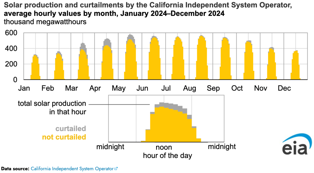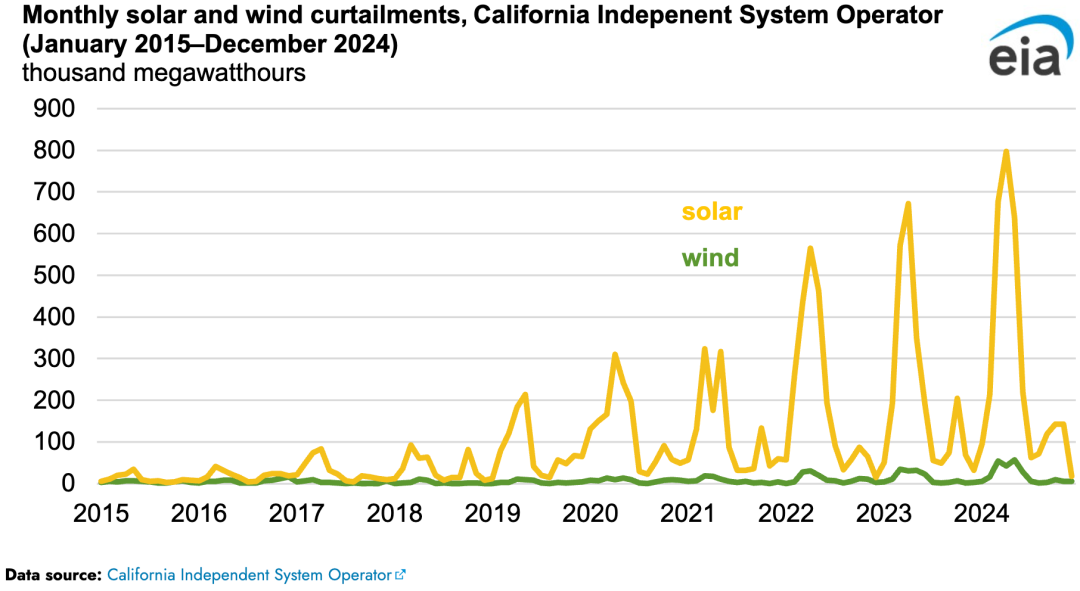 中國儲能網(wǎng)訊:據(jù)美國能源信息署 (EIA)的數(shù)據(jù),加州獨立系統(tǒng)運營商(CAISO,負(fù)責(zé)加州大部分地區(qū)的電網(wǎng)運營)在平衡供需的同時,隨著可再生能源裝機容量的快速增長,越來越多地削減太陽能和風(fēng)能發(fā)電。