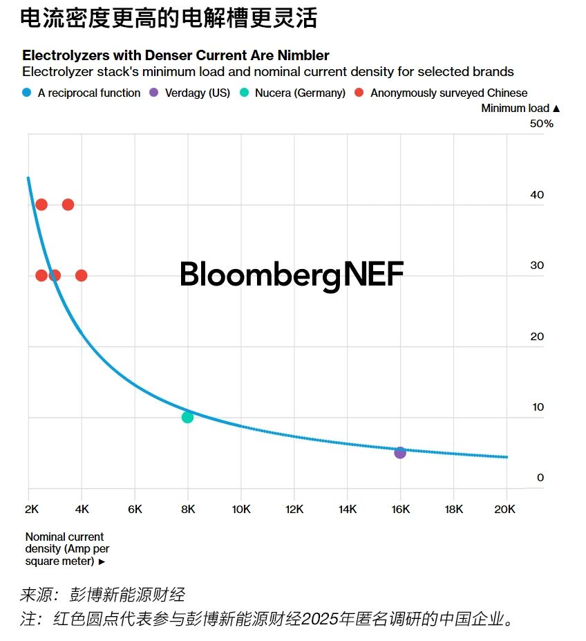 額定電流密度高的槽體最小負荷低,這是好事。問題是,高電流密度往往伴隨著較低的效率——換言之,生產(chǎn)每單位氫需要更多電力。